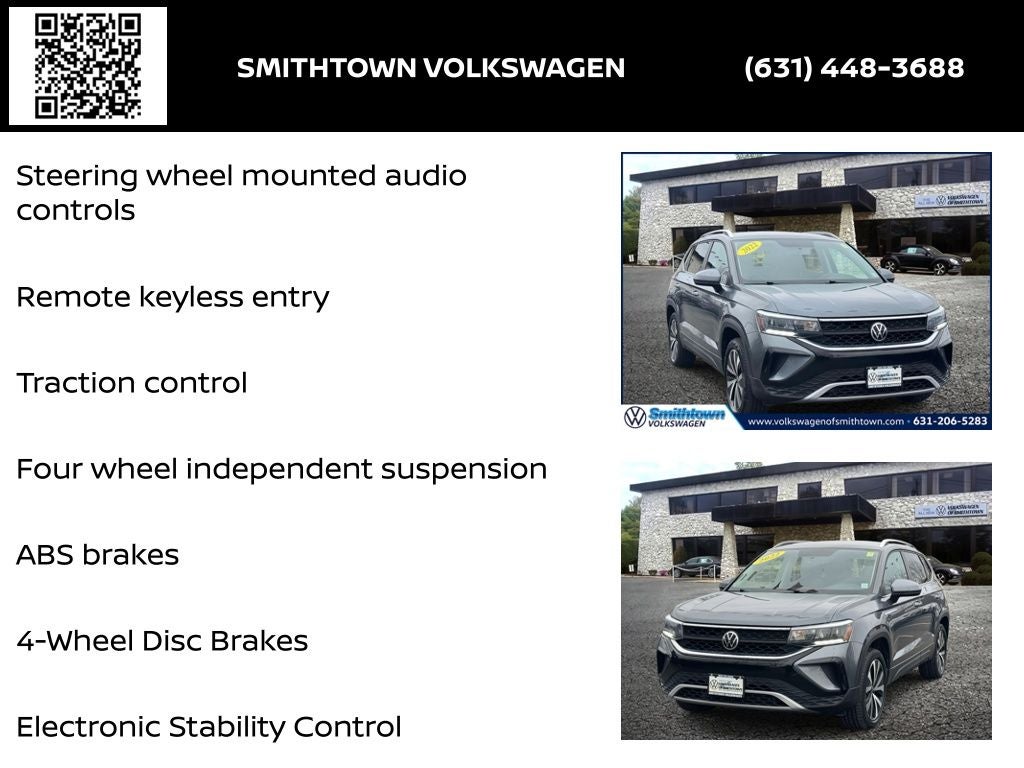 Volkswagen Certified Pre-Owned Certified, 4-Wheel Disc Brakes, ABS brakes, Alloy wheels, Brake assist, Delay-off headlights, Electronic Stability Control, Exterior Parking Camera Rear, Four wheel independent suspension, Fully automatic headlights, Heated door mirrors, Heated Front Comfort Seats, Panic alarm, Power door mirrors, Remote keyless entry, Split folding rear seat, Steering wheel mounted audio controls, Traction control, Wheels: 18 2-Tone Machined Alloy, 5.20 Axle Ratio, 6 Speakers, Air Conditioning, AM/FM radio: SiriusXM with 360L, Bumpers: body-color, CloudTex & Cloth Seating Surfaces, Compass, Driver door bin, Driver vanity mirror, Dual front impact airbags, Dual front side impact airbags, Emergency communication system: Car-Net, Front anti-roll bar, Front Assist, Front Bucket Seats, Front Center Armrest, Front reading lights, Front Strut Rear Multi-Link Suspension, Heated front seats, Illuminated entry, Leather Shift Knob, Low tire pressure warning, Occupant sensing airbag, Outside temperature display, Overhead airbag, Overhead console, Passenger door bin, Passenger vanity mirror, Power driver seat, Power steering, Power windows, Radio data system, Radio: MIB3 Composition Media AM/FM/HD, Rear anti-roll bar, Rear seat center armrest, Rear Traffic Alert, Rear window defroster, Rear window wiper, Roof rack: rails only, Security system, Speed control, Speed-sensing steering, Spoiler, Tachometer, Telescoping steering wheel, Tilt steering wheel, Trip computer, Variably intermittent wipers, 4-Wheel Disc Brakes, ABS brakes, Alloy wheels, Brake assist, Delay-off headlights, Electronic Stability Control, Exterior Parking Camera Rear, Four wheel independent suspension, Fully automatic headlights, Heated door mirrors, Heated Front Comfort Seats, Panic alarm, Power door mirrors, Remote keyless entry, Split folding rear seat, Steering wheel mounted audio controls, Traction control, Wheels: 18 2-Tone Machined Alloy. Your Volkswagen Dealer Near me Yes, we are your Volkswagen Certified Dealer in Smithtown also near Islip Huntington and Oyster Bay Smithtown Volkswagen Certified dealer in suffolk Hablamos español para tus autos en venta.