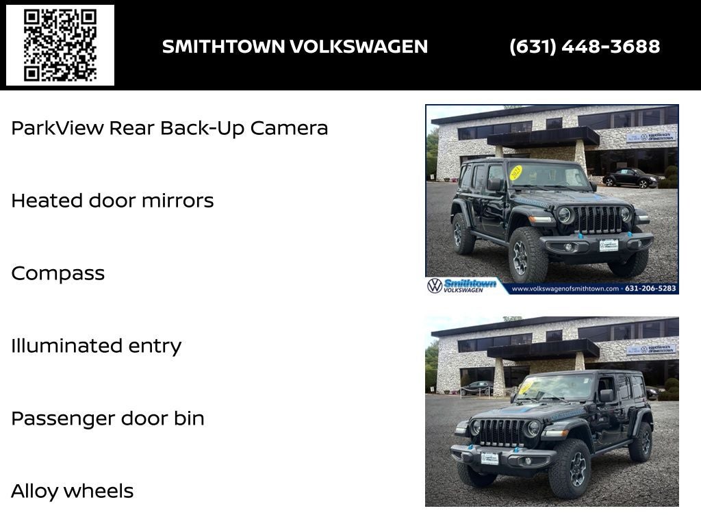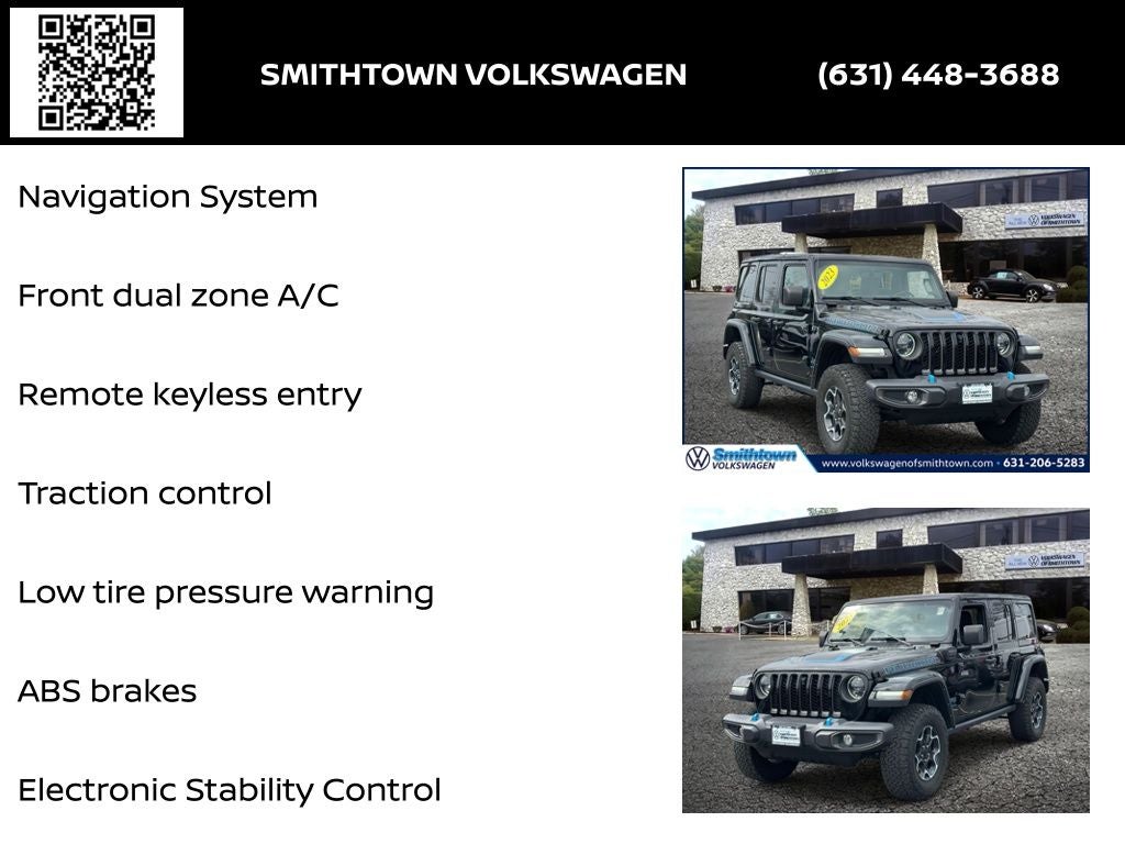 2.0L I4 DOHC, 4-Wheel Disc Brakes, 4.10 Rear Axle Ratio, 7 & 4 Pin Wiring Harness, 700 Amp Maintenance Free Battery, 9 Speakers, ABS brakes, Air Conditioning, Alloy wheels, AM/FM radio: SiriusXM, Apple CarPlay/Android Auto, Auto-dimming Rear-View mirror, Automatic temperature control, Auxiliary Switches, Body Color 3-Piece Hard Top, Body Color Rubicon Highline Flare, Brake assist, Class II Receiver Hitch, Cold Weather Group, Compass, Delay-off headlights, Driver door bin, Driver vanity mirror, Dual front impact airbags, Dual front side impact airbags, Electronic Stability Control, Emergency communication system: SiriusXM Guardian, Freedom Panel Storage Bag, Front anti-roll bar, Front Bucket Seats, Front Center Armrest w/Storage, Front dual zone A/C, Front fog lights, Front License Plate Bracket, Front reading lights, Fully automatic headlights, Garage door transmitter, Heated door mirrors, Heated Front Seats, Heated Steering Wheel, Illuminated entry, Integrated Off-Road Camera, Integrated roll-over protection, Low tire pressure warning, MOPAR All-Weather Floor Mats, MOPAR Hardtop Headliner, Navigation System, Occupant sensing airbag, Outside temperature display, Panic alarm, ParkView Rear Back-Up Camera, Passenger door bin, Passenger vanity mirror, Performance Suspension, Power door mirrors, Power steering, Power windows, Premium Cloth Low-Back Bucket Seats, Quick Order Package 29V Rubicon, Radio data system, Radio: Uconnect 4C Nav w/8.4 Display, Rear anti-roll bar, Rear reading lights, Rear Window Defroster, Rear Window Wiper/Washer, Remote keyless entry, Remote Start System, Security system, Speed control, Split folding rear seat, Steering wheel mounted audio controls, Tachometer, Telescoping steering wheel, Tilt steering wheel, Traction control, Trailer Tow & Aux Switch Group, Trip computer, Variably intermittent wipers, Voltmeter, Wheels: 17 x 7.5 Machined w/Black Pockets, 2.0L I4 DOHC. Your Volkswagen Dealer Near me Yes, we are your Volkswagen Certified Dealer in Smithtown also near Islip Huntington and Oyster Bay Smithtown Volkswagen Certified dealer in suffolk Hablamos español para tus autos en venta.